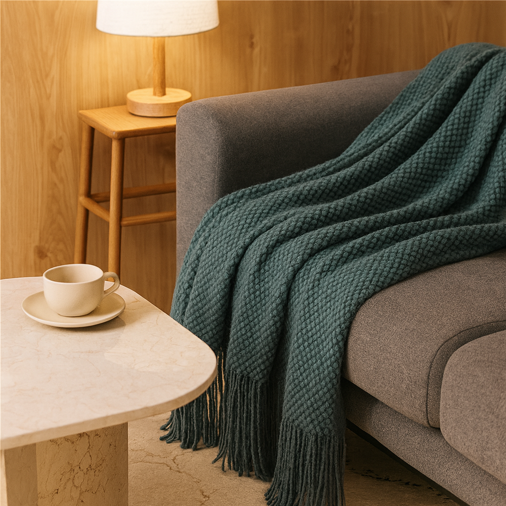 Entwickelt zum Drapieren über Sofas, Stühle oder Betten, verleiht diese Decke mühelose Eleganz. Ihre atmungsaktive Strickstruktur macht sie ganzjährig geeignet, verbindet ästhetische Details mit Vielseitigkeit und funktionalem Komfort.