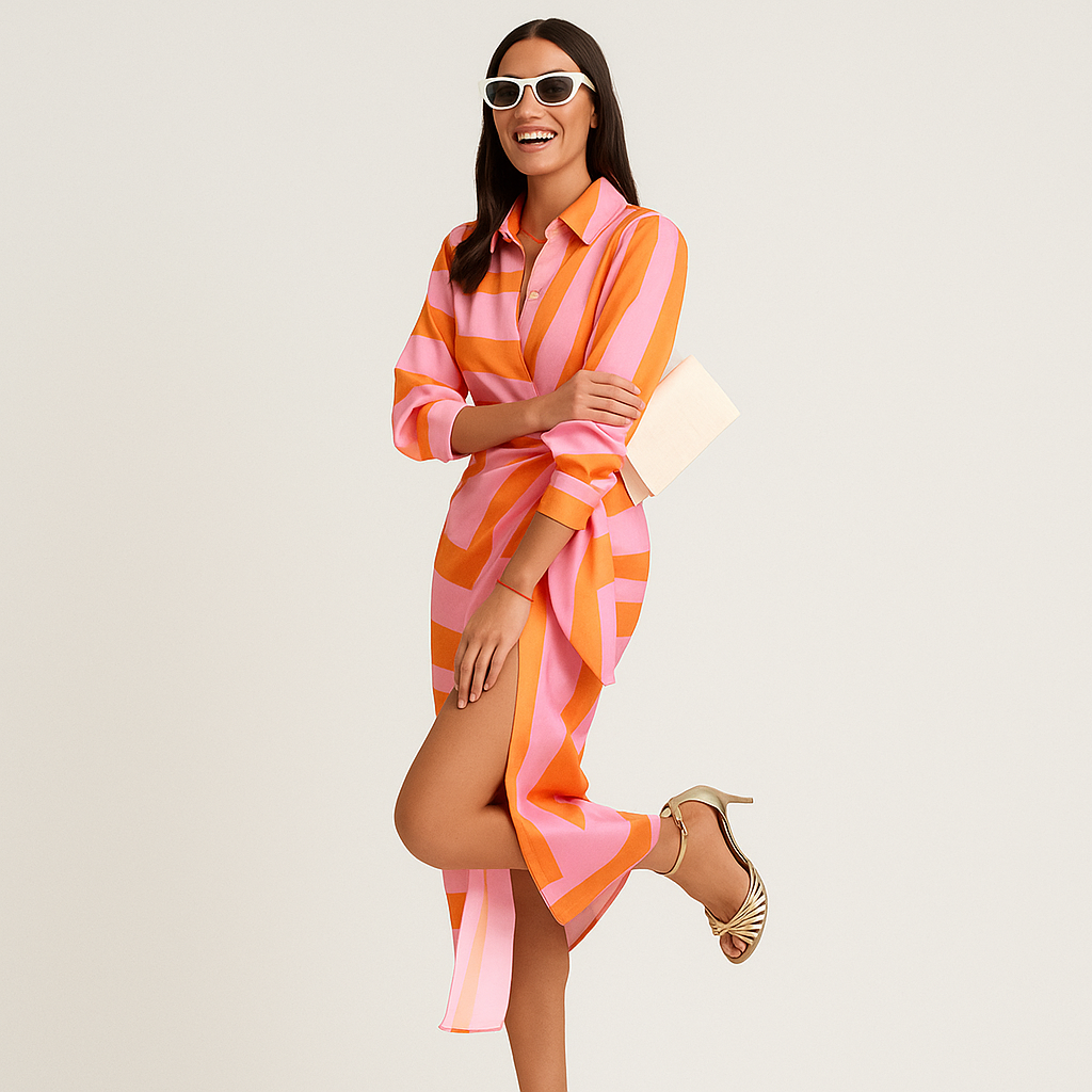 Anna – Sommer-Chic Kleid ist mit einem schmeichelnden Bindegürtel in der Taille designt, der die Figur betont und Eleganz verleiht. Der sanfte Kragen sorgt für einen stilvollen Look, perfekt für alles – vom entspannten Brunch bis zum lauen Sommerabend. Das Kleid ist leicht und anmutig, fällt wunderschön und verleiht deiner Sommergarderobe eine luftige und charmante Note.