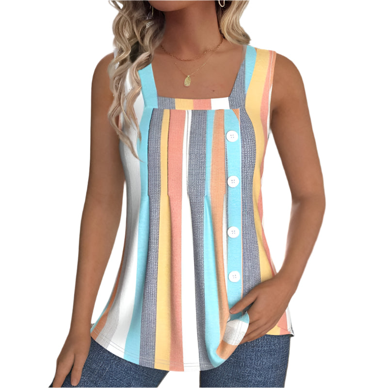 Die Decerie-Bluse ist dein Favorit für einen mühelosen Sommerstil. Mit sanften vertikalen Streifen in Pastellblau, Pfirsich, Gelb und Grau hat dieses ärmellose Top einen schmeichelhaften quadratischen Ausschnitt, ein plissiertes Oberteil und eine charmante Knopfleiste vorne.