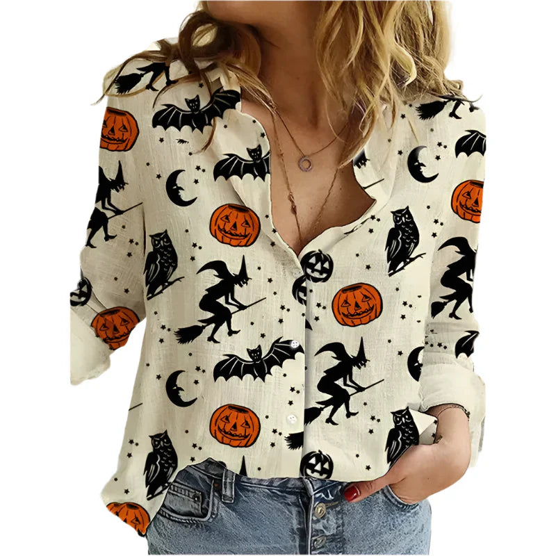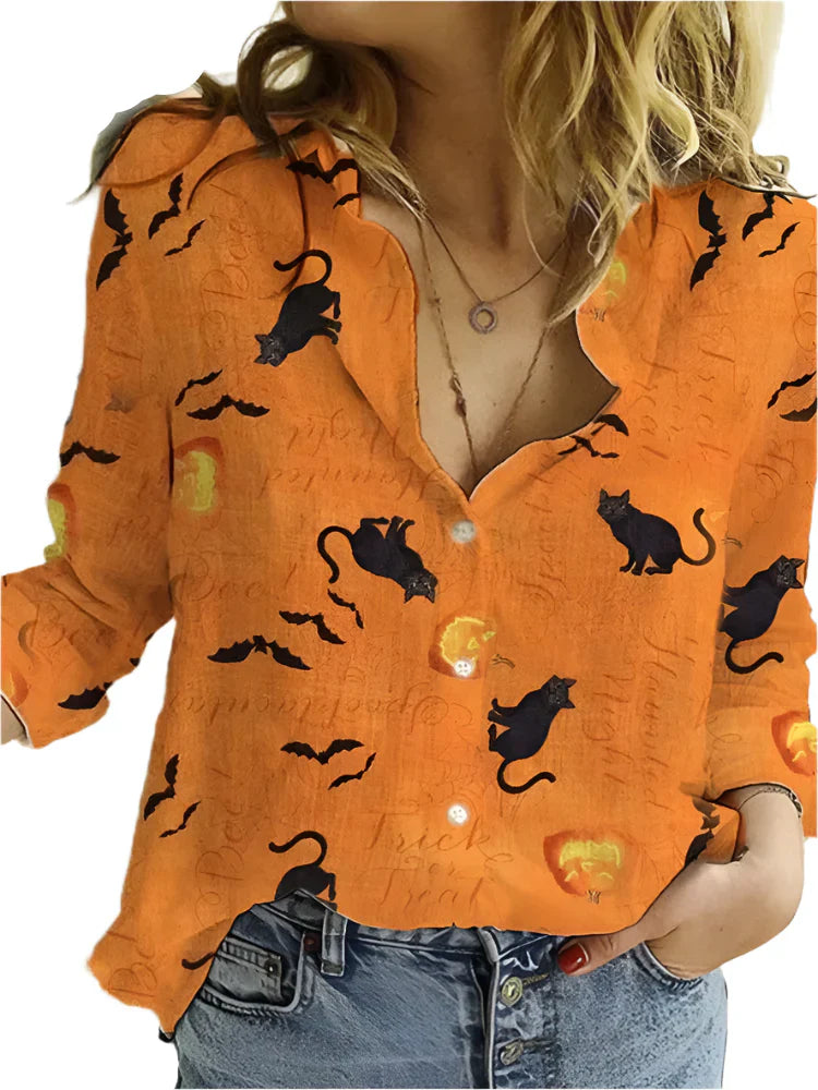 Mit der Dina – Bluse mit unheimlichem Charme erhält Ihr Outfit ein dezentes Statement, das Charme mit einem Hauch von Halloween-Stimmung vereint. Der leichte Stoff und das feine Muster schaffen einen femininen und zugleich verspielten Look, der die Bluse vielseitig für saisonale Stylings und den Alltag macht.