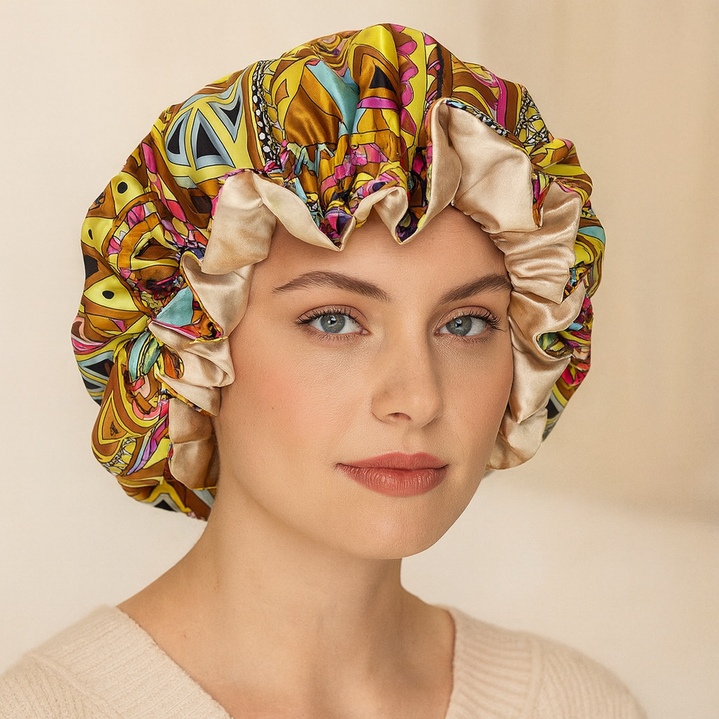 Die Helen Bonnet ist sowohl auf Schönheit als auch auf Funktionalität ausgelegt und bietet einen sicheren, aber angenehmen elastischen Sitz. Ihr stilvolles Aussehen macht sie perfekt für die Schlafenszeit oder zum Entspannen, wobei sichergestellt wird, dass Ihr Haar geschützt bleibt, während Sie stilvoll relaxen.